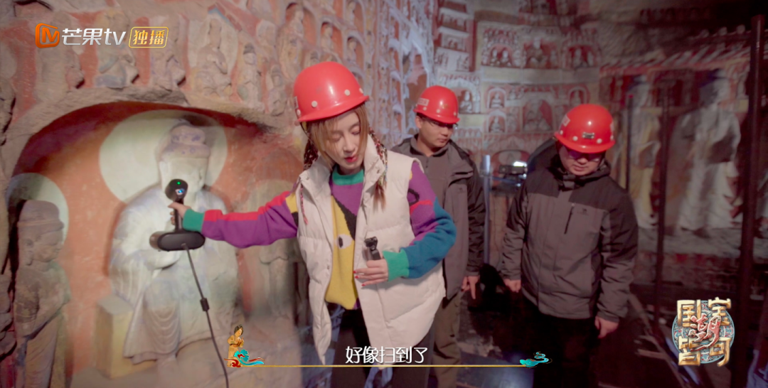 而这石窟云游的第一步就是数字重生。不像博物馆恒温恒湿的储存环境,云冈石窟暴露在室外,历经一千五百多年的沧桑还在不断地风化消亡,因此,云冈石窟的数字化保护成为了第一要务。第一站,在一群90后的“扫窟人”的带领下,冯青体验了云冈石窟数字化采集的流程。由于云冈石窟不仅是复杂宏伟的空间艺术,且洞窟造像精致细腻,想要在云游的模型中体现洞窟空间的纵深感以及文物的精细程度,就对数字采集的技术和数据有着极高的要求。