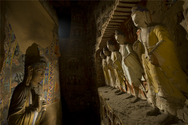 南壁明窗与窟门之间屋形大龛内,七立佛造像气韵高雅,个个褒衣博带,脚踏莲花,由东而西一字排开,姿态飘逸,背光装饰异常华美,场面壮阔,气势非凡,是同时期七佛雕像的代表作。