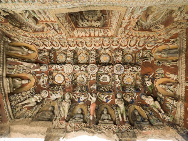 该窟西壁中层北侧,在宽7.4米,高2.4米横向拉开的中国瓦顶屋形龛下雕刻了7身立佛,个个褒衣博带,神采奕奕,不仅是石窟寺七佛题材的突出表现,也是佛教造像艺术中国化的代表作品。