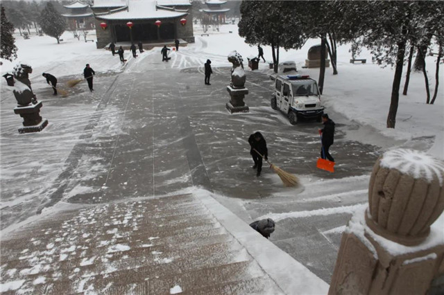 入冬第一周,云冈研究院领导带头,干部职工齐上阵,清扫积雪,开辟通道。由于雪势太大,后勤科打破常规,不按责任区分片,组织力量率先清扫山门、主路、客服中心、停车场、昙曜广场、礼佛大道、山堂水殿、石窟群等处的积雪。 清理出来的积雪没有倒掉,而是就近消化,全部堆入树坑和草坪中。眼下,那场雪虽已过去半个多月,但在云冈景区的山坡林地等背阴处,依旧是雪国景象。2008年2月,大同市委、市政府将云冈石窟周边环境综合治理工程列为全市三大建设项目之一,历时3年全部完成。云冈景区面积扩大10倍,达到2.3平方公里,云冈石窟迈入全国一流旅游区行列。