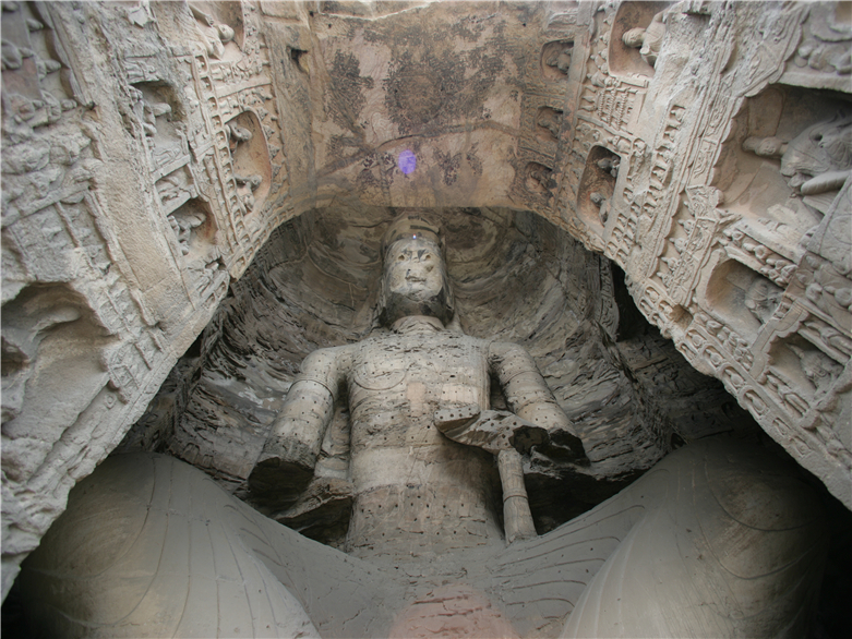 主像是菩萨装的交脚弥勒,高15.6米,头戴宝冠,胸佩蛇饰及短璎珞,臂着钏,斜披络腋,束腰收腹,下穿羊肠长裙,狮子座,具有浓郁的异域情调。西壁立佛面庞浑圆,造型古朴壮美。东壁坐佛双肩齐挺,服饰线条流畅,刀法娴熟。窟内四壁以千佛雕刻为主,雕像清简劲直,纯真朴质,反映了云冈早期造像的艺术特点。西壁佛像背光外缘供养天,单腿半跪,双手捧莲,神情恬静,造型优美。明窗东壁太和十三年(487)造像龛,是云冈石窟分期断代的重要标尺。