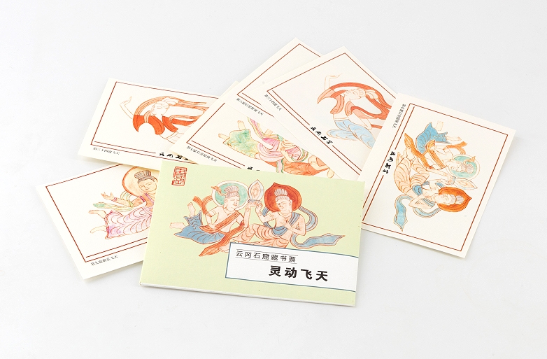 藏书票是贴在书籍里封上的小小的装饰画,既有欣赏性,又有装饰性,而更特别的是它与读书、包括广泛的文化传播相结合,成为有实用价值的边缘艺木,被称誉为“艺苑珍珠”。云冈藏书票图案内容丰富,采用雕刻中的装饰纹样、飞天、佛像背光、老照片、临摹拓片以及以素描形式表现的云冈“六美人”。云冈系列藏书票工艺精良,色彩古朴典雅,具有馈赠与珍藏价值。