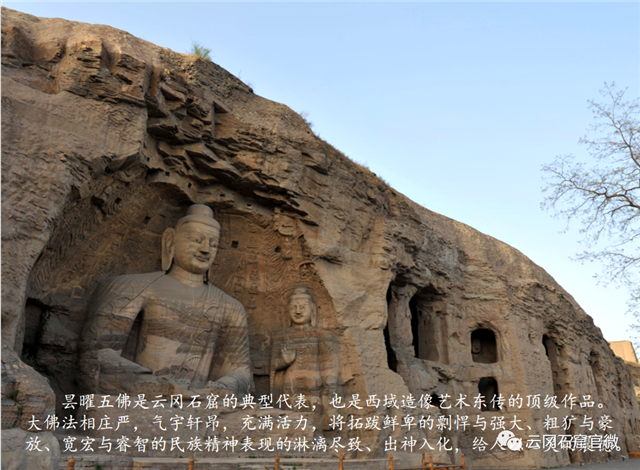 第五,西风东渐,共铸辉煌。北魏对西域的征服,直接迎来了我国历史上第二次东西文化交流的高潮。作为丝绸之路东端的大都会,平城迅速成为胡商梵僧云集之地。印度石窟造像之风,经由新疆,波及河西、关陇,至平城而特盛,进而流布中华。武州山石窟的创作,最初是凉州僧匠带来了西域风格的佛教造像艺术,然后是古印度、师子国、西域诸国的胡沙门带着佛经、佛像和画本,随商队、使团而至,再后是昙曜建议征集全国各地的宝像于京师,最后是徐州僧匠北上主持云冈佛事。一代代、一批批高僧大德、艺匠精工,共同设计、共同制作,创造出云冈石窟一座座旷世无双的佛国天堂。