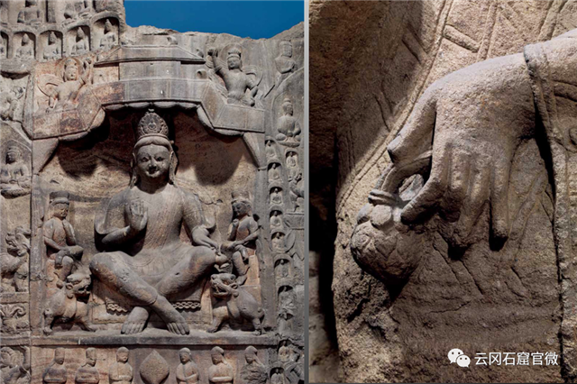 第7、8窟是云冈营造最早的双窟,窟顶用莲花与飞天装饰的平棋藻井,赋予中国传统建筑样式以佛国仙境般的浪漫。第7窟门拱两侧的三头四臂神像,头戴尖顶毡帽,极具中、西亚特征;第8窟门拱两侧,三头八臂的摩醯首罗天骑神牛,五头六臂的鸠摩罗天驾金翅鸟,其形象来源于古印度神话中的天神湿婆和毗湿奴,他俩一位可以毁灭宇宙,另一位则能够创造世界。这种将婆罗门教大神转化为佛教护法神的现象,是印度密教思想的反映,完全属于西来像法,为中西石窟寺的绝版遗存。第9、10窟是中国传统的殿堂式建筑,但其窟外前庭由雄狮、大象驮起的廊柱和建筑造型,则混合皆备了古印度与希腊、罗马建筑艺术风格;后室门廊两侧的金刚天王,不似他窟的逆发胡神,而是头顶鸟翅。第5、6窟规模宏大,前者为大像窟,主尊高达17﹒4米,为云冈佛像之最;后者为塔庙窟,设计完整,雕刻纷繁,尤以描述释迦牟尼生平故事的系列浮雕“壁画”,著称于世。第12窟亦为廊柱式殿堂窟,俗称音乐窟,其前室北壁上方的伎乐天手持各种东、西方乐器,宛若一支“交响乐团”,是研究我国古代音乐史的珍贵素材。这些富丽堂皇的洞窟建筑,绚丽多彩的石刻艺术,惊世骇俗的伟大创造,是中华民族奉献给全人类的不朽杰作。
