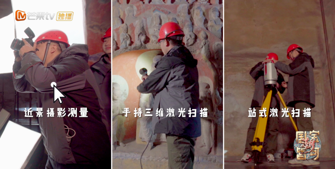 而这石窟云游的第一步就是数字重生。不像博物馆恒温恒湿的储存环境,云冈石窟暴露在室外,历经一千五百多年的沧桑还在不断地风化消亡,因此,云冈石窟的数字化保护成为了第一要务。第一站,在一群90后的“扫窟人”的带领下,冯青体验了云冈石窟数字化采集的流程。由于云冈石窟不仅是复杂宏伟的空间艺术,且洞窟造像精致细腻,想要在云游的模型中体现洞窟空间的纵深感以及文物的精细程度,就对数字采集的技术和数据有着极高的要求。