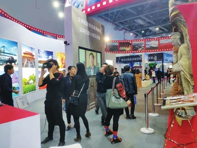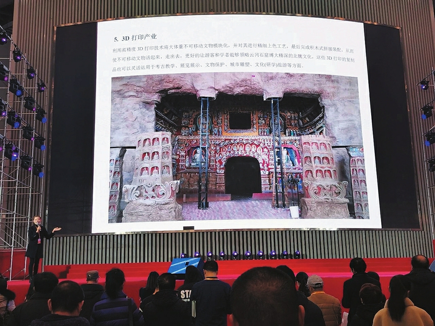 云冈石窟讲解员在第四届山西文博会大同文化旅游推介会上介绍云冈石窟文化产业发展