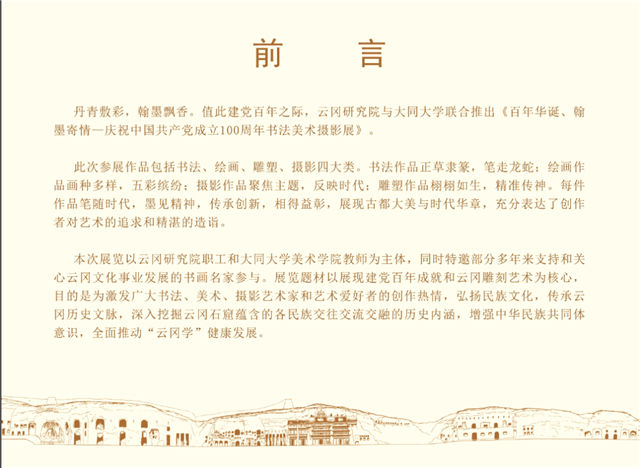此次展览以云冈研究院职工和大同大学美术学院教师为主体,同时特邀多年来支持和关心云冈文化事业发展的部分书画名家参与,以展现建党百年成就和云冈雕刻艺术为宗旨,共计展出书法、绘画、摄影、雕塑等作品230余件。目的在于充分激发我市广大艺术爱好者的创作热情,弘扬民族文化、传承历史文脉,深入挖掘云冈石窟蕴含的各民族交往交流交融的历史内涵,增强中华民族共同体意识。