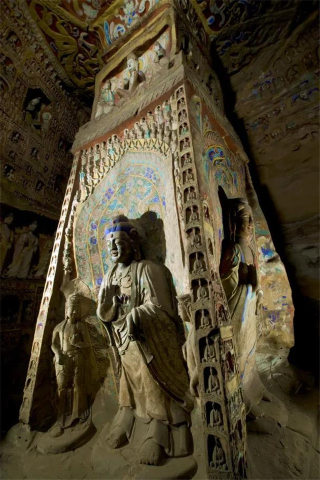 第11窟,洞窟内中央为中心塔柱,典型的塔庙窟,塔柱分三层,第一层四壁各雕一立佛,为“四方四佛”。塔柱上层亦四面开龛造像。塔顶四角雕山花蕉叶,中雕阿修罗像。顶部四周各雕两条蛟龙,为“天龙八部”之龙部,雕刻传神,是云冈石窟龙部雕刻的精品。
