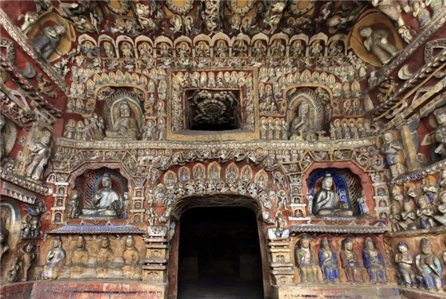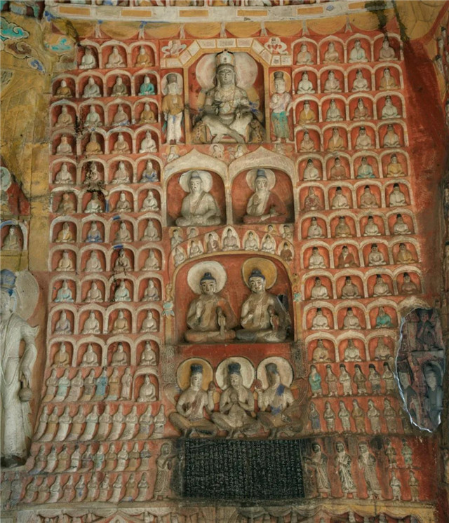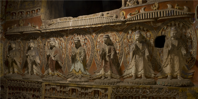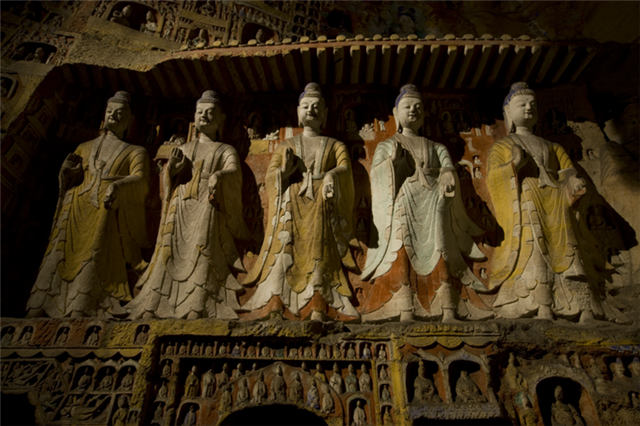 该窟西壁中层北侧,在宽7.4米,高2.4米横向拉开的中国瓦顶屋形龛下雕刻了7身立佛,个个褒衣博带,神采奕奕,不仅是石窟寺七佛题材的突出表现,也是佛教造像艺术中国化的代表作品。