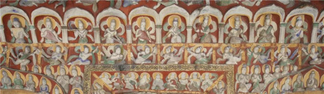 第12窟内,只觉:影中群像动,空里众灵飞。衣带轻举,翩翩起舞的飞天,或疾升、或陡转、或漂浮。满壁的天人正随着乐曲旋律跃跃欲试,飞天面容姣美,发髻高耸,深情优雅,丽舞翩翩,背上云带飞卷,胸下流云飘旋,浮掠于空、翻飞自若。