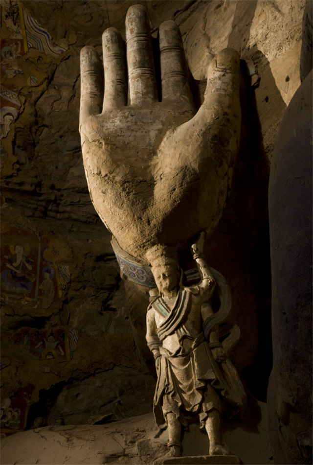 最精妙之处当属大佛右手臂肘下的托臂力士,独具匠心,长有四臂,两臂高举托起大佛右臂,两臂撑腰,造型奇特优美,使得庄严肃穆的洞窟顿时透出活跃的气息。这样的创作,既在力学上起到支撑巨大手臂的作用,又兼收美学上的装饰效果,同时还以力士的动来显示佛之静、以力士的小来衬托出佛之大,可谓鬼斧神功。