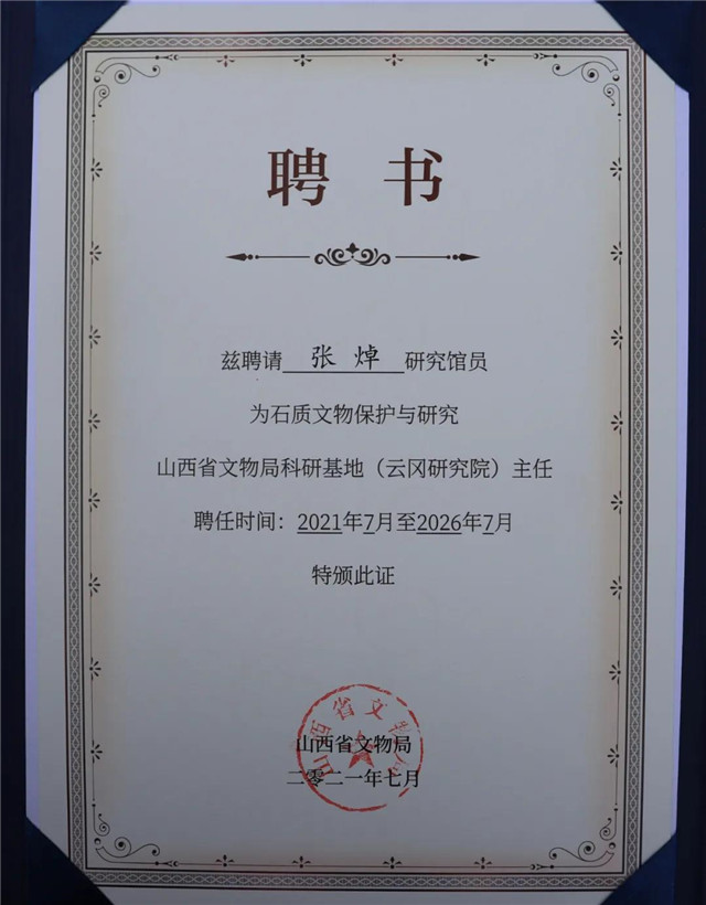 为深入学习习近平总书记在庆祝中国共产党成立100周年大会上的重要讲话精神,认真贯彻落实习近平总书记关于文物工作的系列重要论述,准确把握新时代文物科技创新战略定位和任务要求,充分发挥科技创新在我省文物保护利用中的引领与支撑作用,7月12日—16日,由山西省文物局主办,大同市文物局、云冈研究院承办的山西省文物科技创新能力提升培训班在大同贵宾楼假日酒店云冈厅开班。云冈研究院被授予石质文物保护与研究山西省文物局科研基地,云冈研究院党委书记张焯受聘为科研基地主任。