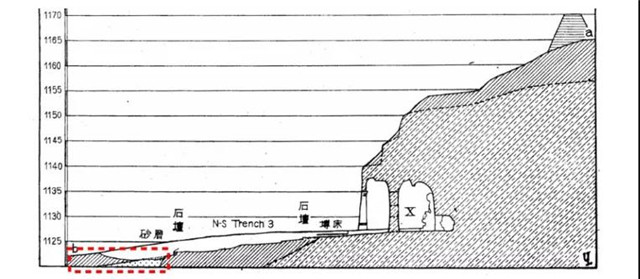 ▲ 1940年日本学者在云冈石窟五华洞前发掘到的砂层范围,砂层即武州川河道旧迹