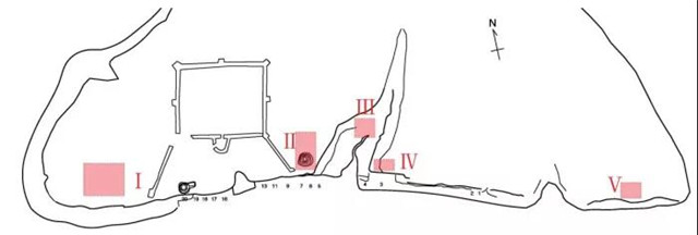 19世纪40年代,日本学者首先在云冈窟顶开展了小规模考古工作,发现了北魏和辽代的遗物与建筑遗迹(Ⅰ、Ⅲ、Ⅳ)。1993年,云冈石窟在配合“八·五”保护维修工程开展窟前遗址发掘期间于东部窟群山顶发现一座北魏塔基(Ⅴ)。2010-2011年,山西省考古研究所、云冈石窟研究院、大同市考古研究所联合在云冈窟顶一区和二区开展了连续两年的大规模发掘,发现两处北魏至辽金的佛教寺院遗址(Ⅰ、Ⅱ),被评为2011年全国十大考古新发现。云冈石窟山顶寺院的面貌逐渐被后人揭开。