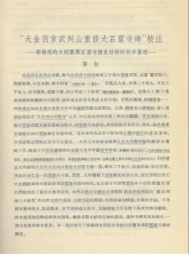 ▲缪荃孙抄校《永乐大典·顺天府》中《大金西京武州山重修大石窟寺碑》书影。该碑文为金皇统七年(1147年)夷门曹衍应大传菩萨戒提点西京大石窟寺沙门禀慧之邀请而撰写的。元至正二十三年(1363年),熊自得亲访云冈,抄录《金碑》全文,后补入《析津志》一书内。▲宿白《“大金西京武州山重修大石窟寺碑”校注——新发现的大同云冈石窟寺历史材料的初步整理》论文书影据《金碑》记载,在北朝之后,云冈石窟在唐代、辽代、金代等时期都有过修治,特别是在辽、金时期,都进行过大规模的建设活动。1972年至1993年,通过在五华洞窟前建筑遗址、龙王庙沟西侧寺院遗址和第三窟窟前遗址的考古发掘工作,发现了多处辽金时期的窟前建筑遗迹,并一处辽代寺院基址。而2011年在云冈窟顶二区建筑遗址中所发现的塔基,其内部为方形的北魏塔基,外部则为后期加建的八角形塔基,八角形是辽塔中较为普遍的形制,此处的塔基,可能正是辽代在云冈浩大的重修工程的一部分。石窟、窟前建筑与窟顶寺院,共同构成了辽金时期云冈石窟的信仰空间与景观。