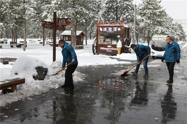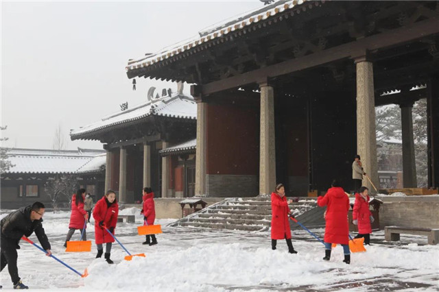 入冬第一周,云冈研究院领导带头,干部职工齐上阵,清扫积雪,开辟通道。由于雪势太大,后勤科打破常规,不按责任区分片,组织力量率先清扫山门、主路、客服中心、停车场、昙曜广场、礼佛大道、山堂水殿、石窟群等处的积雪。 清理出来的积雪没有倒掉,而是就近消化,全部堆入树坑和草坪中。眼下,那场雪虽已过去半个多月,但在云冈景区的山坡林地等背阴处,依旧是雪国景象。2008年2月,大同市委、市政府将云冈石窟周边环境综合治理工程列为全市三大建设项目之一,历时3年全部完成。云冈景区面积扩大10倍,达到2.3平方公里,云冈石窟迈入全国一流旅游区行列。