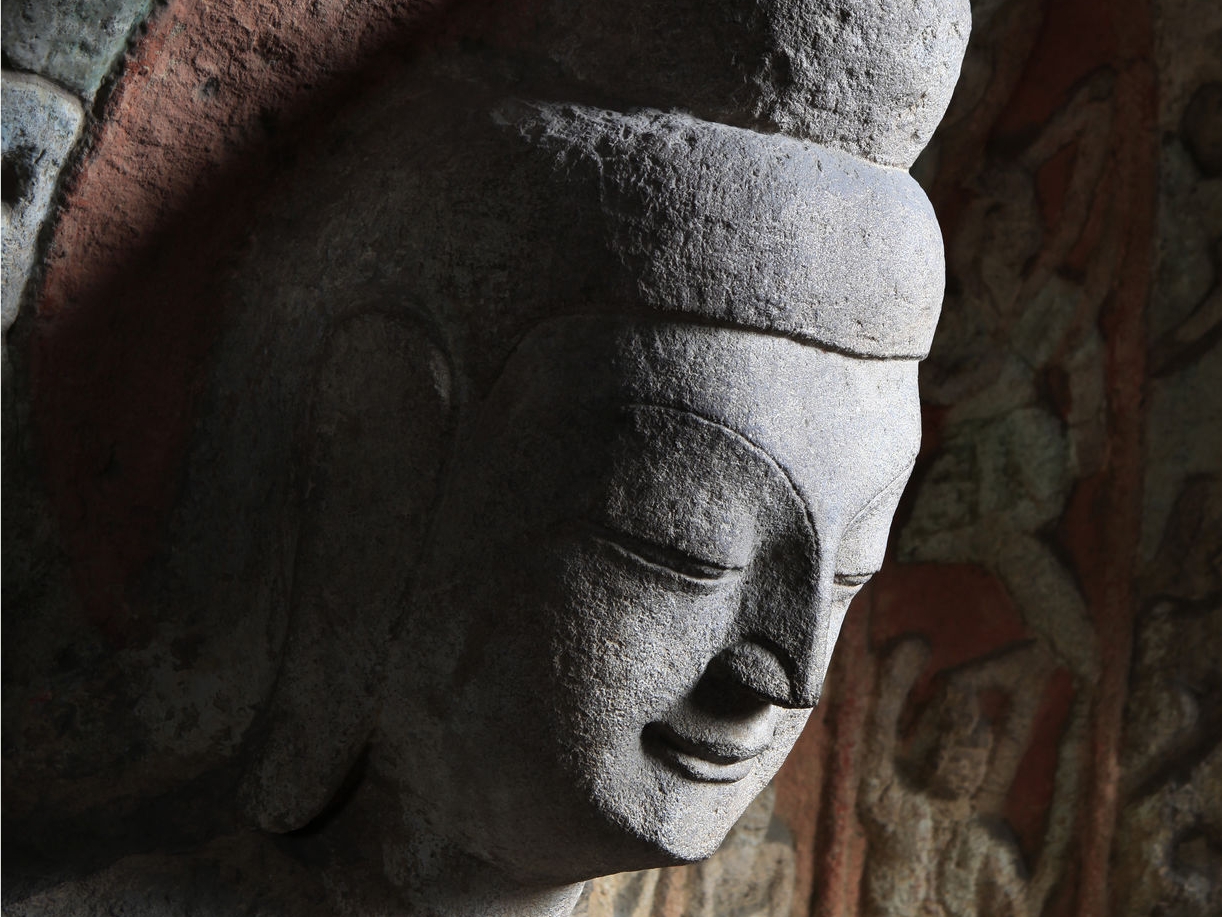 第5窟位于东部石窟群西侧,是云冈石窟的中期洞窟之一。该造像位于第5窟阁楼上层东侧,佛像高肉髻,面相适中,眉眼细长,嘴角上翘,双耳垂肩,线条简洁流畅,清秀典雅。恭敬的神态表情以十分洗练娴熟的刀法雕出的端庄和秀微,而眼帘下垂给人以无限的遐想,最富东方色彩的一颦一笑剔透如生,精美绝伦,令人惊叹,表现了艺术家异常突出的雕刻成就,是云冈石窟雕刻艺术品中的精品。