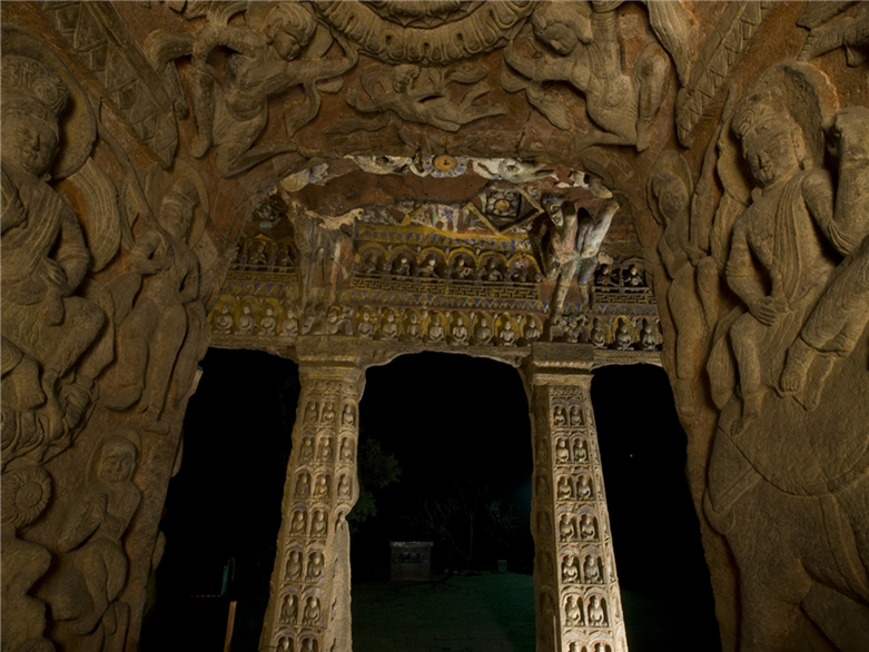 第九、十窟为一组双窟,前后室结构,汉式殿堂布局。窟门列楹柱,面各三间。柱雕千佛,承以狮、象,蔚为壮观。第九窟窟门为仿中国传统庑殿式建筑,两侧对称布龛,分层雕刻,中西合璧,具有浓重的装饰意味。窟内四壁分层布龛,造像题材多出自《法华经》。窟顶格状,格内雕团莲及飞天,八夜叉体魄健硕,力举万钧,单手承托横枋。后室北壁主像雕释迦,东西两壁各一胁侍菩萨。