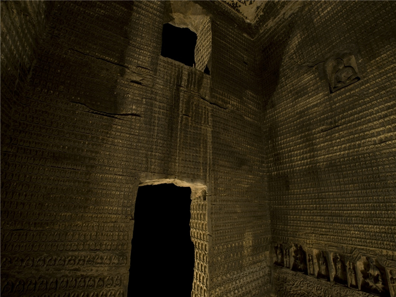 方形单窟室,以表现千佛题材为主,旧称“千佛洞”。窟内现存造像逾万,故又称“万佛洞”。这些象征释迦分身的十方化佛,排列有序,构图严谨。西壁盝形帷幕龛基博山炉两侧,雕刻鱼鸟水藻,呈现出沙鸥翔集、鱼跃于渊的自然景致。下方龛额伎乐飞天,天衣灵动,缥缈若仙,飞翔的态势与上方波动的水草,韵律谐合。