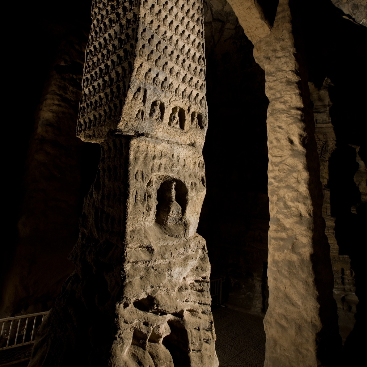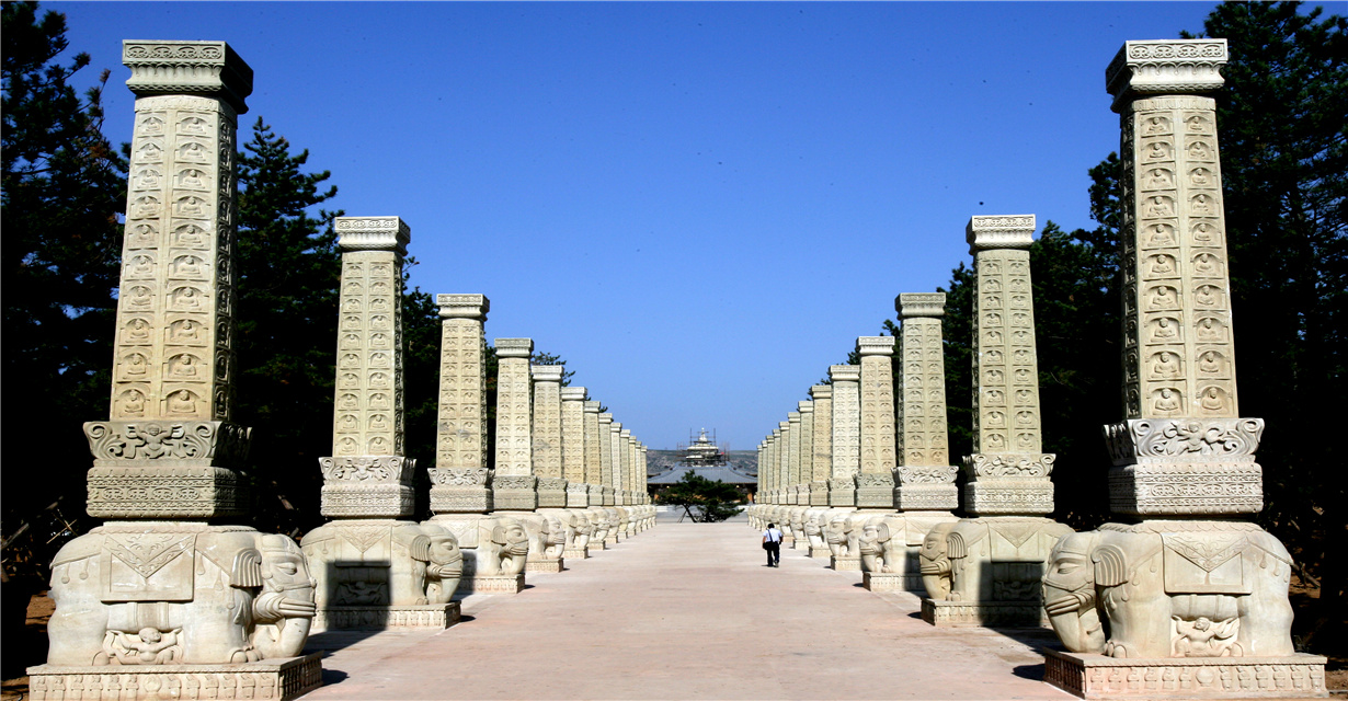 所谓礼佛大道:“恩泽普武周,慈航通法岸”。向西走去,十三对千佛列柱依次列于礼佛大道两侧。神柱高8.73米,系黄沙岩雕刻,由下而上依次为须弥座、力士、白象、柱体的完美组合,造型高耸、精致亘绝,在两侧浓密的松林掩映下,矗立的神柱气势雄伟、蔚为壮观,仿佛通天入地...