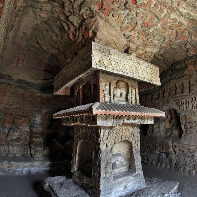 窟外壁明窗上方及西侧题刻“山水有清音”、“云深处”。窟内三级方塔居中,塔面上刻出瓦筒、檐椽、斗拱等仿木建筑构件 上层四角镂刻八角柱。窟内四壁分层分段布局,最上层雕刻天宫伎乐列龛,下面依次为锯齿纹垂幔带、禅定坐佛带、大型列龛、长卷式浮雕故事,最下层为供养人列像。北壁主像为释迦坐佛,风化严重。东壁下层浮雕太子“箭射铁鼓”佛传故事。该窟地下有泉水涌出,旧名“寒泉洞”。