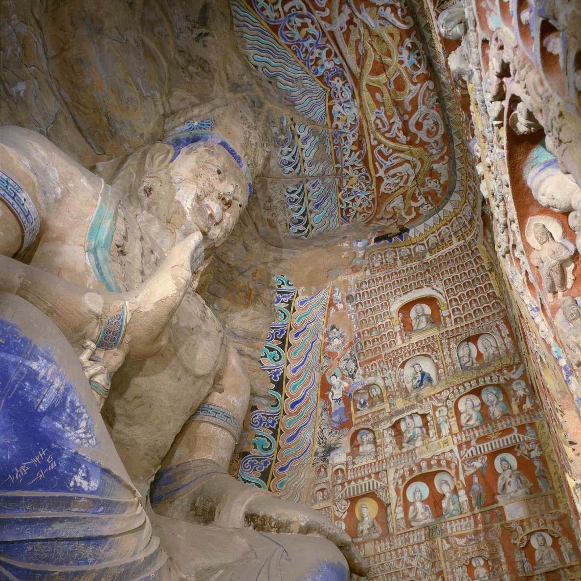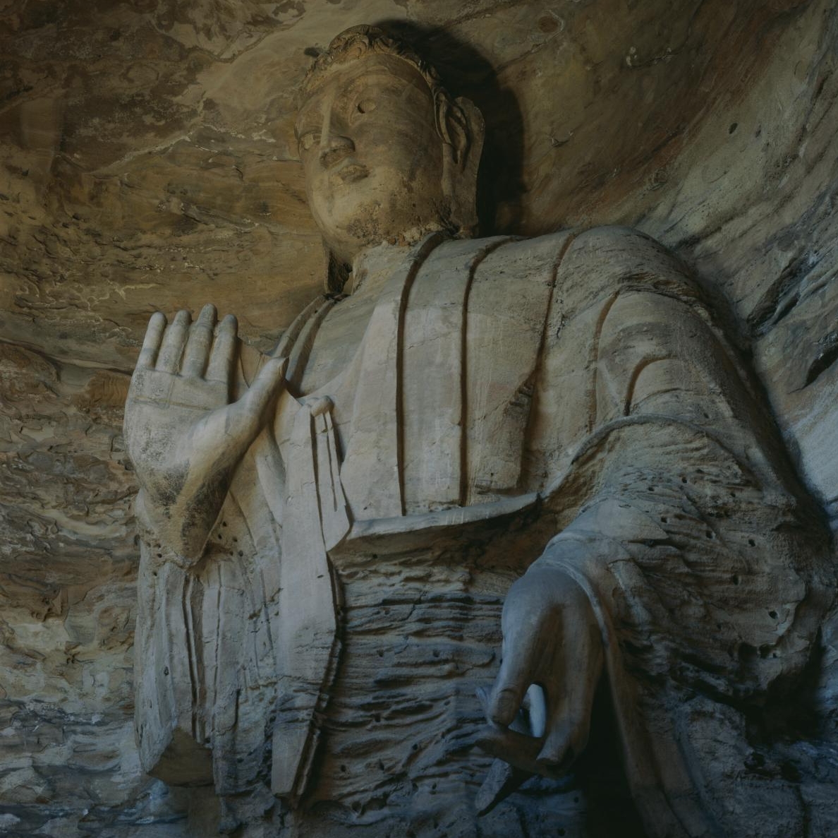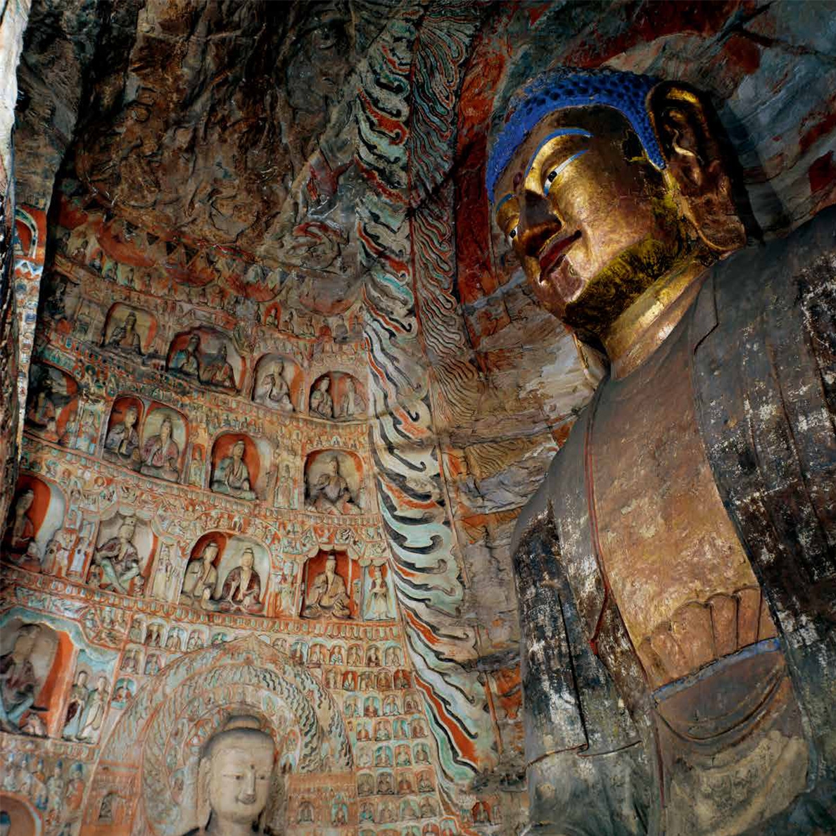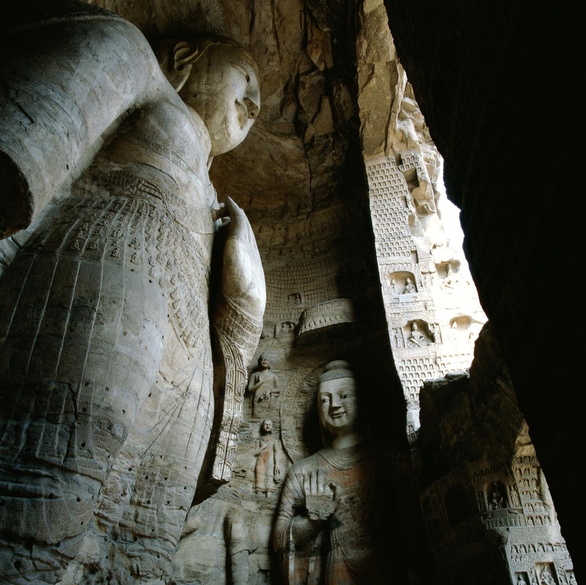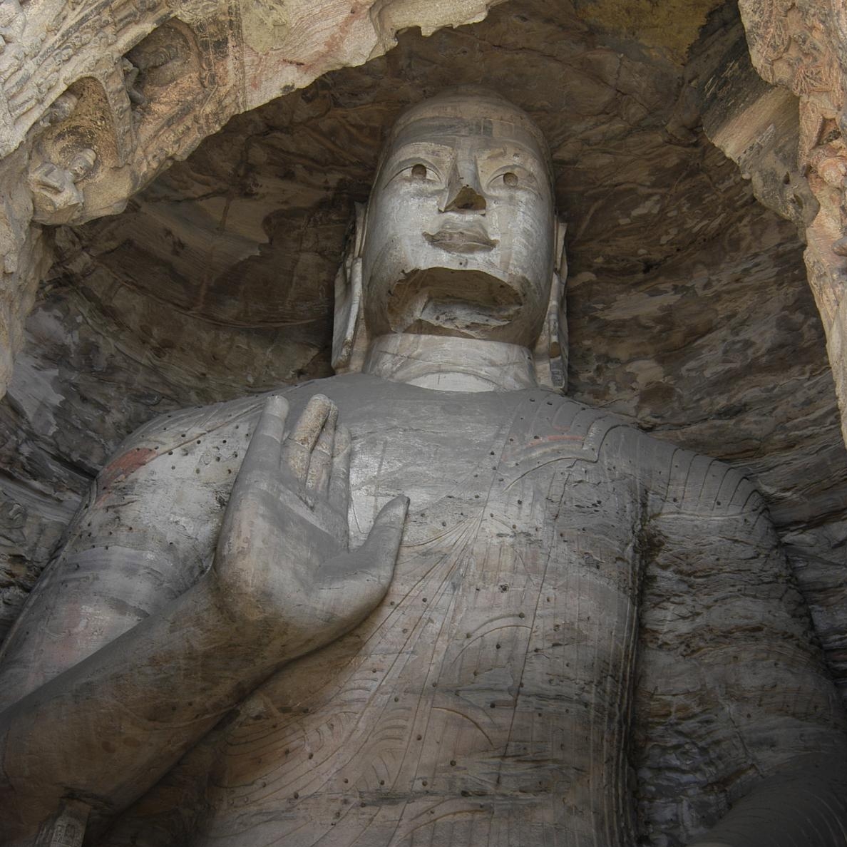 云冈石窟位于中国山西省大同市城西约16公里的武州(周)山南麓、武州川的北岸,地理位置为东经113º20’,北纬40º04’。石窟依山开凿,规模恢弘、气势雄浑,东西绵延约1公里,窟区自东而西依自然山势分为东、中、西三区。现存主要洞窟45个,附属洞窟209个,雕刻面积达18000余平方米。造像最高为17米,最小为2厘米,佛龛约计1100多个,大小造像59000余尊。