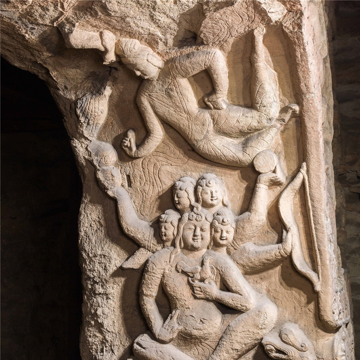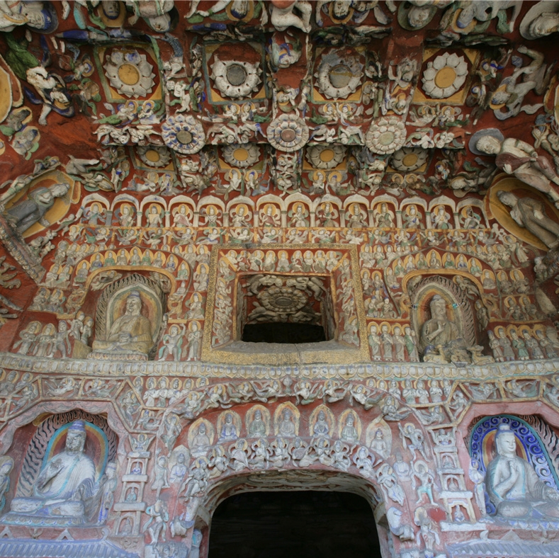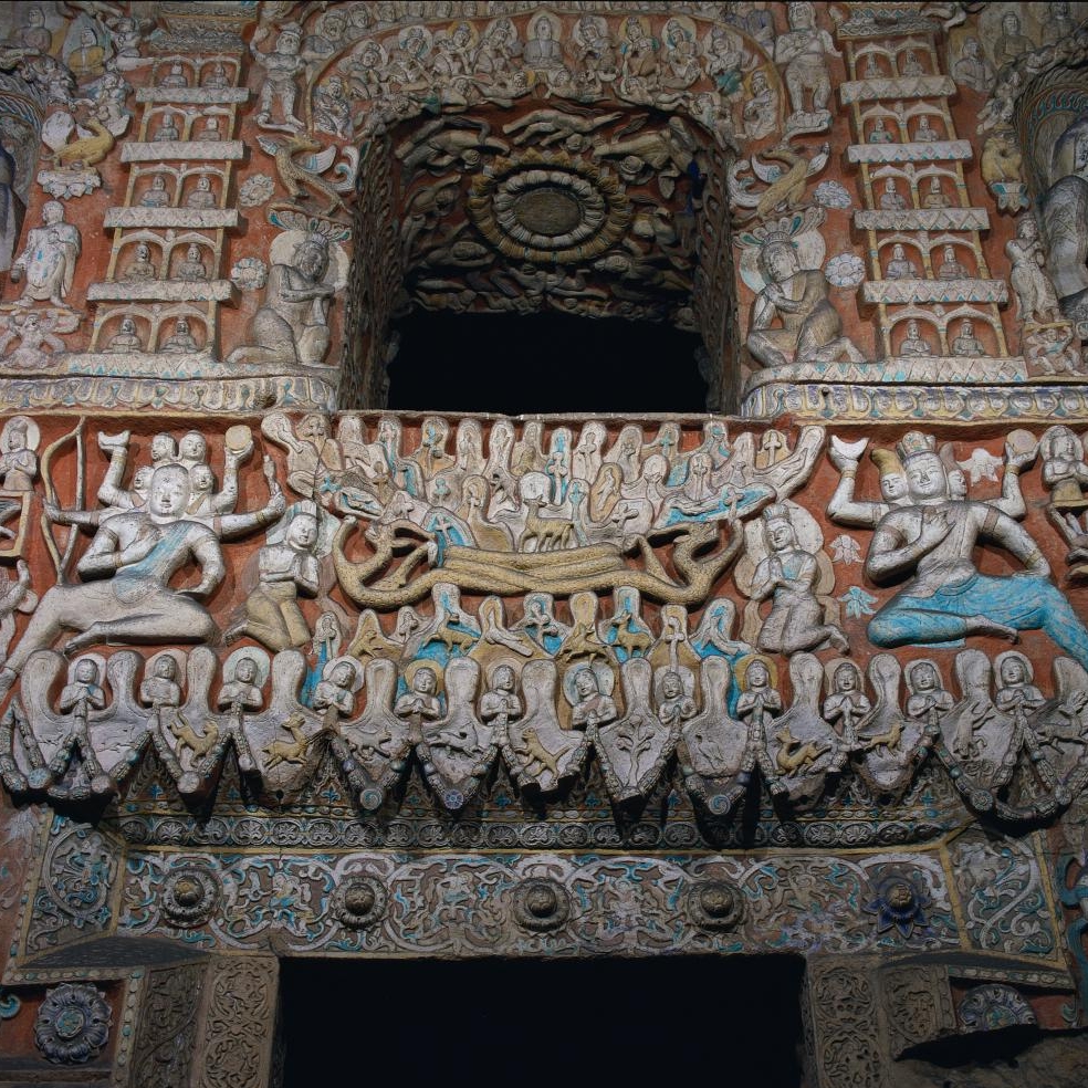 穿过神柱林立的佛光大道向西,呈现于世人眼前的是两面相对的扇形皇家礼佛浮雕墙。这组正面相对的浮雕墙总体呈圆弧状,长约20米、高约4米,画面构图完美,雕刻细致,以高浮雕的形式,生动表现了北魏皇家盛大的帝后礼佛图。车辚辚、马萧萧的现场气氛,充分再现了北魏当时皇帝...