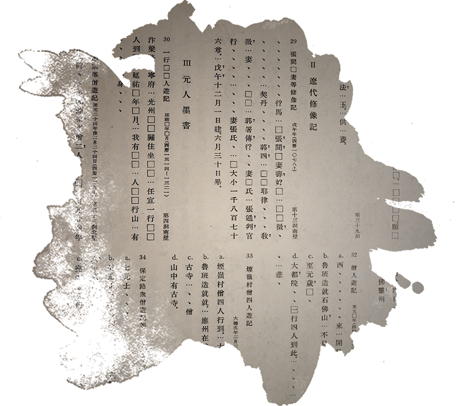 一、禀慧所修灵岩元末尚存 按《析津志》引碑文于“前西京”下接“癸卯年腊月二十四日,予自东胜来,是日宿于寺之方丈,受清供,次日达西江。次年二月八日始录上草本于何尚书思诚东斋。”碑文撰年是皇统七年丁卯(1147),上距癸卯计二十四年,即金天会元年(1123),下距癸卯计三十六年,即金大定二十三年(1183),因知此段文字非曹衍碑文,而是《析津志》作者熊自得自述旅程的记录,该癸卯应是元顺帝至正二十三年(1363)。由这段旅程记录,可证熊自得至正二十三年腊月二十四日曾亲至禀慧所修的灵岩,并宿于灵岩方丈受清供,由此可推定元末此灵岩尚存。 二、云冈的元代游人题记 云冈元代墨书题记二处:一在第4窟南壁,一在第33窟北壁。前者有延祐 (1314—1320)纪年,后者有至元十三年(1276)、至元二十三年(1286)、至元廿四年(1287)、大德五年(1301)等纪年。 三、昙曜五窟前发现的长方砖 抗日战争期间,日人挖掘和1954年云冈古迹保养所清理窟前时,都曾在昙曜五窟前辽代敷地方砖之上,发现辽金以后所敷的长方砖地面。这长方砖地面,我们怀疑它与所论明中叶以前十名尚存有关。十名尚存则必有修缮,而这长方砖约即辽金以后修缮十寺的残存遗物。至于修缮的时间,根据砖的形制,最迟似不能下及明初以后。 四、明末以前的云冈 明代大同沦为边防地区,云冈似又行荒废,包括上述金元灵岩在内的云冈十寺,这时都逐渐毁坏,以至湮灭无闻。毁坏的绝对时间,我们虽不能确切指出,但从云冈现存的明代遗迹、遗物上推察,知约在明代中叶以后。云冈现存的明代遗迹、遗物有: 1.嘉靖三十七年(1558)所建、万历二年(1574)修葺的云冈堡城 在冈南。 2.嘉靖四十三(1564)《重修云冈堡碑》 现存石佛古寺内。 3.万历二年所建的土城 在冈上。《雍正朔平府志》卷八:“云冈堡建於明嘉靖三十七年,万历甲戌(即万历二年,1574)改建于冈上,周一里四分零,高连女墙三丈五尺。地近腹裏,无分管边墙,止设火路墩八座。今(顺治间,1644一1661)裁并。”北京大学图书馆藏抄本《光绪左云县志》卷三:“云冈堡……新旧二堡。旧堡设崖下,嘉靖之戊午(即嘉靖三十七年)也。因北面受敌,议移冈上,万历之甲戌也。旧者仍留,以便行旅,新者尚土筑,女墙系砖包,共高三丈五尺,周围一里五分”。 4.万历十九年(1591)立“开山历代祖师墓塔”(插25)在冈上土城东北隅。 5. 万历四十八年(1620)吴伯与“石佛寺碑” 现存石佛古寺内。 6.崇祯二年(1629)立“妙明□□墓塔” 在冈上土城北端。 7.崇祯十七年(1644)铸大佛寺铁钟 现存石佛古寺内。 其中万历十九年所立的开山历代祖师墓塔更比较明显的暗示了明末以前云冈寺院的恢复,而吴伯与《石佛寺碑》云:“奇树yi'n[花-化+映]楼阁以葱茏……方岳玄中张公命酒其上”,当即指云冈再次恢复以后的寺院建筑。