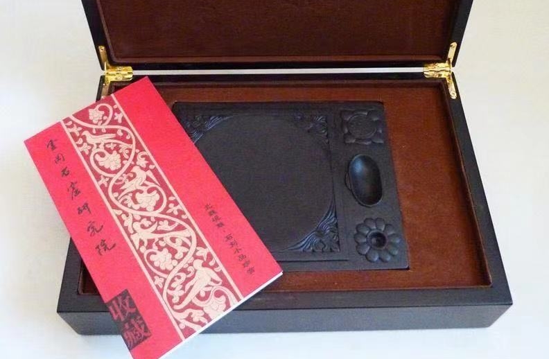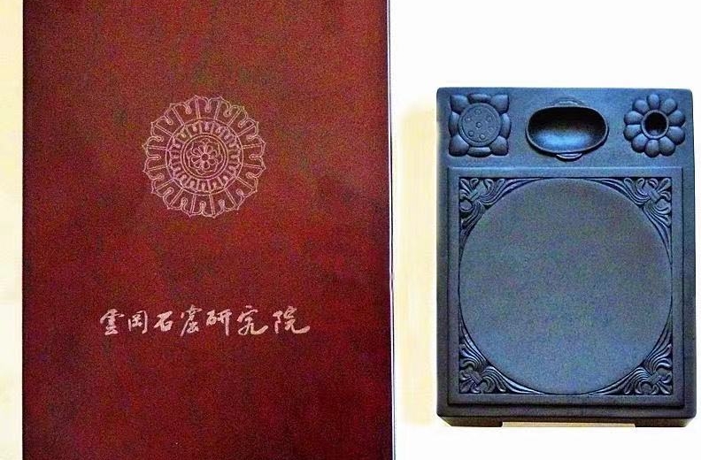 大方砚用浅灰色细砂岩雕成。正方形,长宽均21.6、高9.1厘米。正中突出长宽各12厘米的方形砚盘,以联珠纹和莲花纹作边框。砚心两侧相对各有一对耳杯形水池和一对方形笔舔,池两端高雕二龙交缠与二鸟交颈相对共衔杯,或是簸鲵相咬托耳杯。