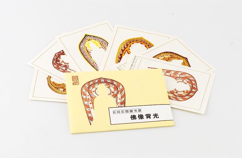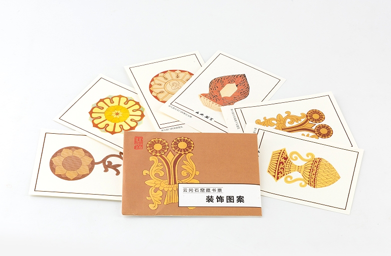 藏书票是贴在书籍里封上的小小的装饰画,既有欣赏性,又有装饰性,而更特别的是它与读书、包括广泛的文化传播相结合,成为有实用价值的边缘艺木,被称誉为“艺苑珍珠”。云冈藏书票图案内容丰富,采用雕刻中的装饰纹样、飞天、佛像背光、老照片、临摹拓片以及以素描形式表现的云冈“六美人”。云冈系列藏书票工艺精良,色彩古朴典雅,具有馈赠与珍藏价值。