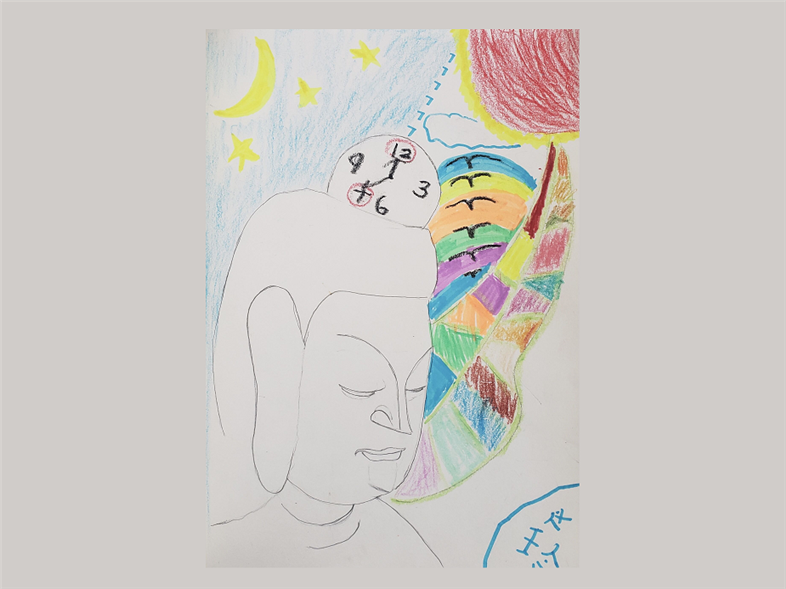 早上太阳还没有升起,爸爸告诉我是7点的时候,妈妈就要去一个有大佛的地方开始新的一天。到了月亮和星星出来的时候,妈妈就回来了。我的生活就像大佛旁五彩斑斓的树叶一样多姿多彩。一盒新蜡笔,一盒新荧光笔都会让我很开心,所以我把他们画在了大佛旁。一只只黑色的“人”字形大雁就像我们一大家子,小小的我跟在家人的后面飞呀飞呀……