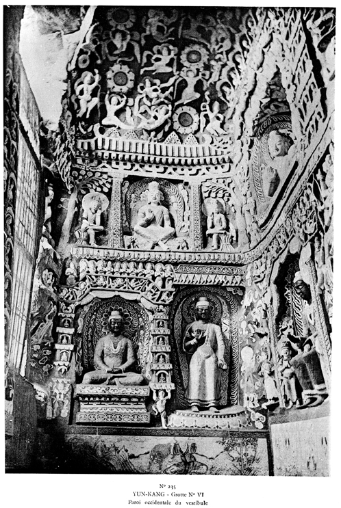 对于云冈石窟的研究,不仅日本学者慕名而来,法国和瑞典一些热衷于东方学的学者也开始将目光投向这一佛教圣地。1907年,法国汉学家沙畹在云冈进行考察,拍摄了大量照片,择取其中78幅,收录于之后著成的《华北考古学使命记》和《北中国考古图录》,这些照片不仅成为当时国内外学者了解云冈石窟的一个窗口,而且对于今天的研究也极具参考价值和历史价值。1925年,瑞典学者喜龙仁著《中国雕刻——从五世纪到十四世纪》(四卷本),在伦敦出版。书中共有云冈图版66幅,同时对云冈石窟雕刻艺术的特点进行了论述,认为云冈造像明显具有印度式和汉地本土两种风格。