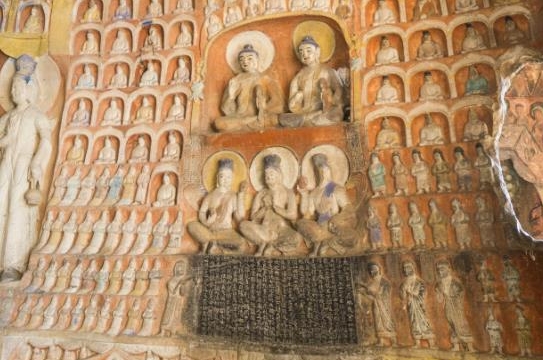 附注:这是云冈石窟现存最早、字数最多、保存最好的一块造像题记。题记体现了三个层次的愿望:一是“为国兴福”,祈愿国祚永康,十方归伏。二是“愿义诸人”位超群首,永与苦别。三是“愿同邑诸人”常为法善知识,常行大士之事,福报永世。题记与所造龛像符契相和。所造”九十五区”像是指供养群上方造像,其中千佛88身(有2身毁),4佛(二佛对坐、两单坐),3身菩萨(一交脚二供养菩萨)。“诸菩萨”是指并排而坐的文殊、势志、观音三菩萨。“信士女等五十四人”形象是题记和菩萨两侧的世俗供养人造像,其中右侧36身女性供养人(2名邑师不计),左侧18身男性供养人(有2身毁,4名邑师不计)。此记对研究北魏平城地区佛事活动有着重要价值,被看做是云冈皇家石窟北魏太和七年(483)向民间开放造窟的标志,第11窟内众多的无统一布局的龛像证明了这一推测。另外,此题记是中国石窟现存最早的北魏造像题记,也是中期魏碑的重要遗存,记中有约40多个碑别字,是研究魏书别字书体的稀有参考资料。