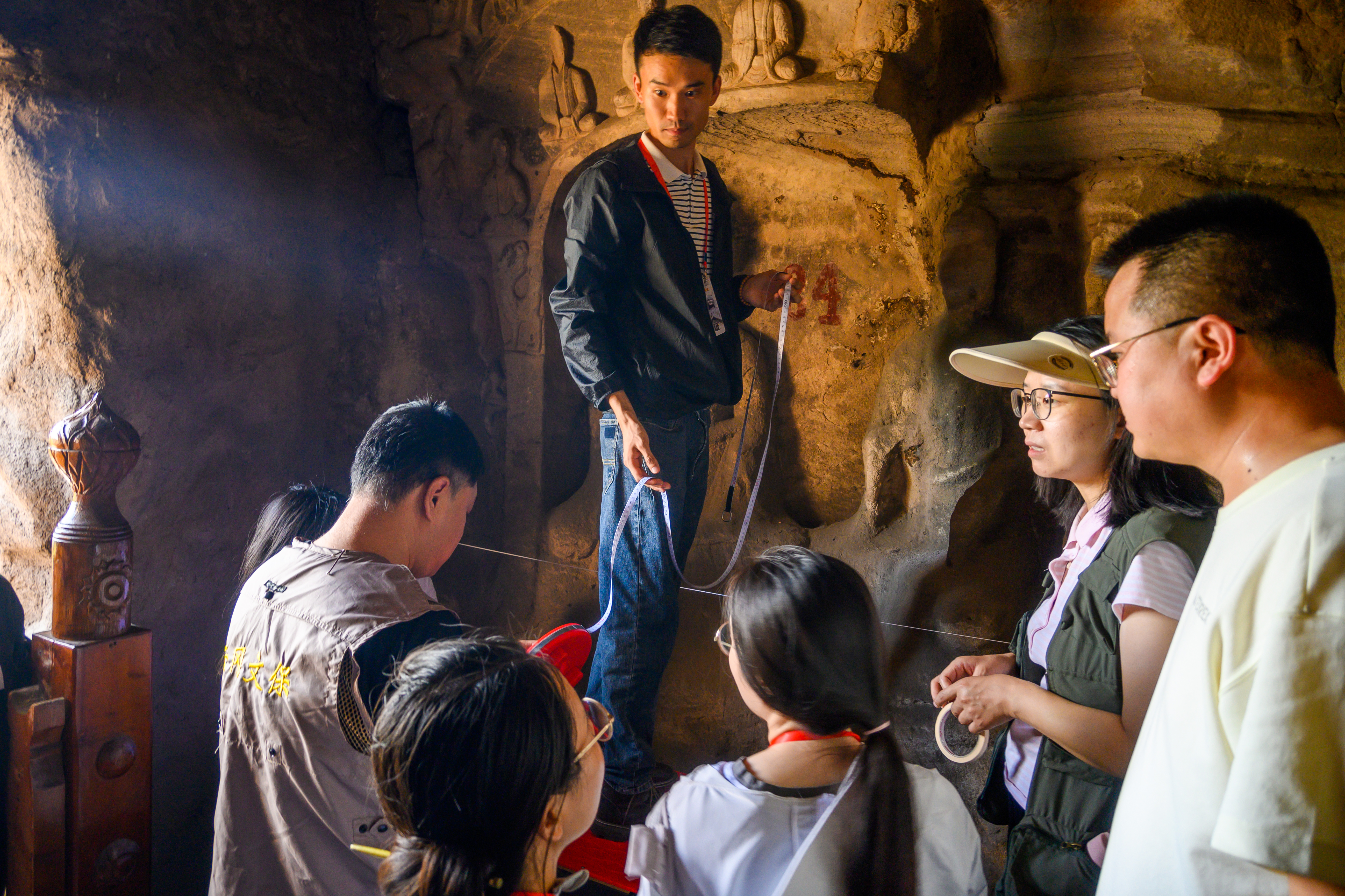 本次工作坊以云冈第21-28窟为测绘洞窟,进入测绘实操阶段。云冈研究院石质文物保护研究室孙波为大家实地进行讲解及演示。学员们学习了搭基准线,使用水平仪测量,绘制剖面图等传统石窟测绘的基本方法。本次测绘着眼于回归传统方法,旨在训练大家的手工测绘技能,培养观察、记录、描述的能力,加深对石窟内涵的认识理解。两天半的测绘实习,各组同学分工明确,顶着酷暑完成了测绘内容。