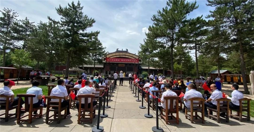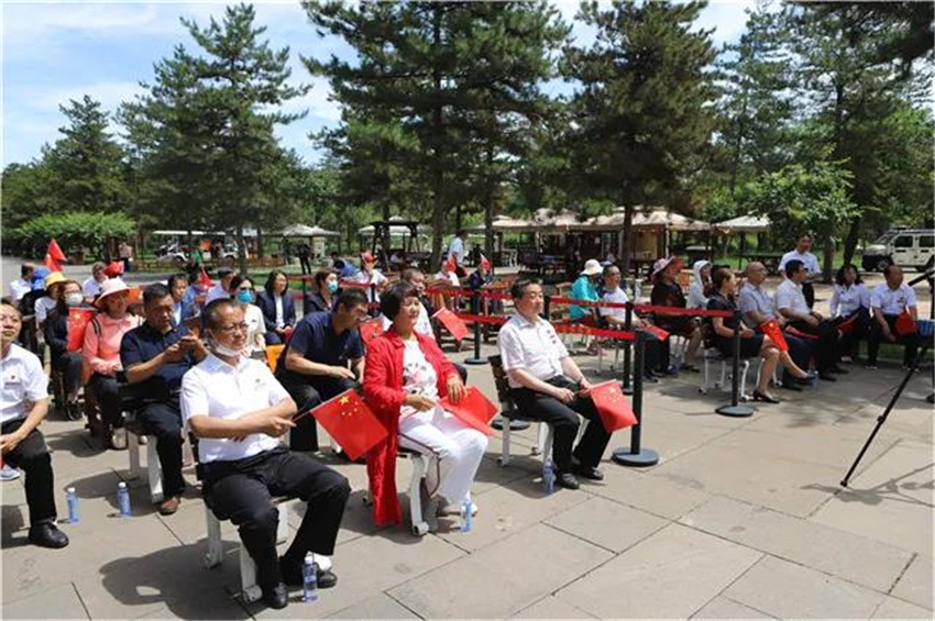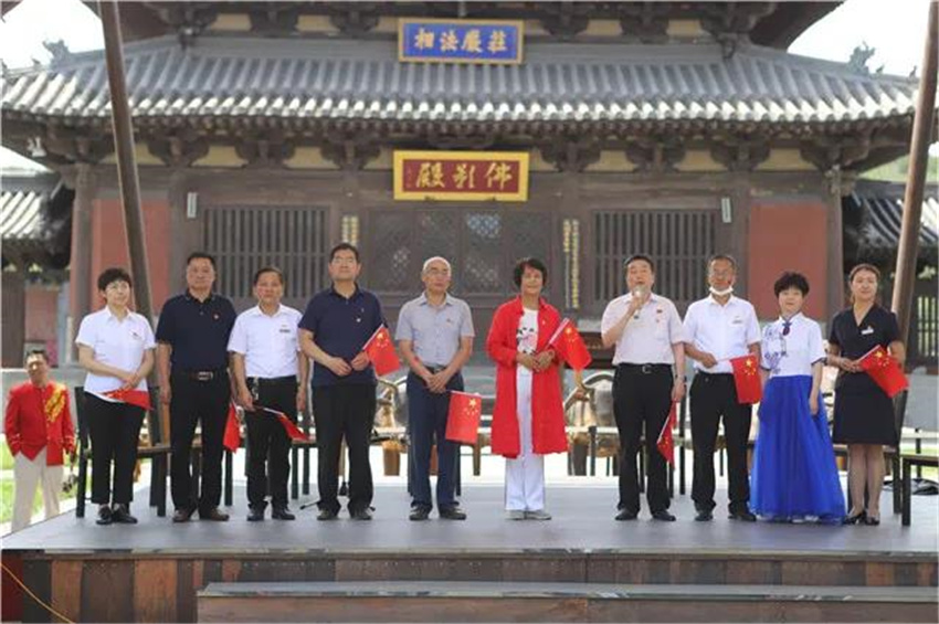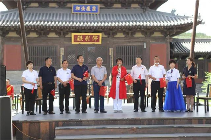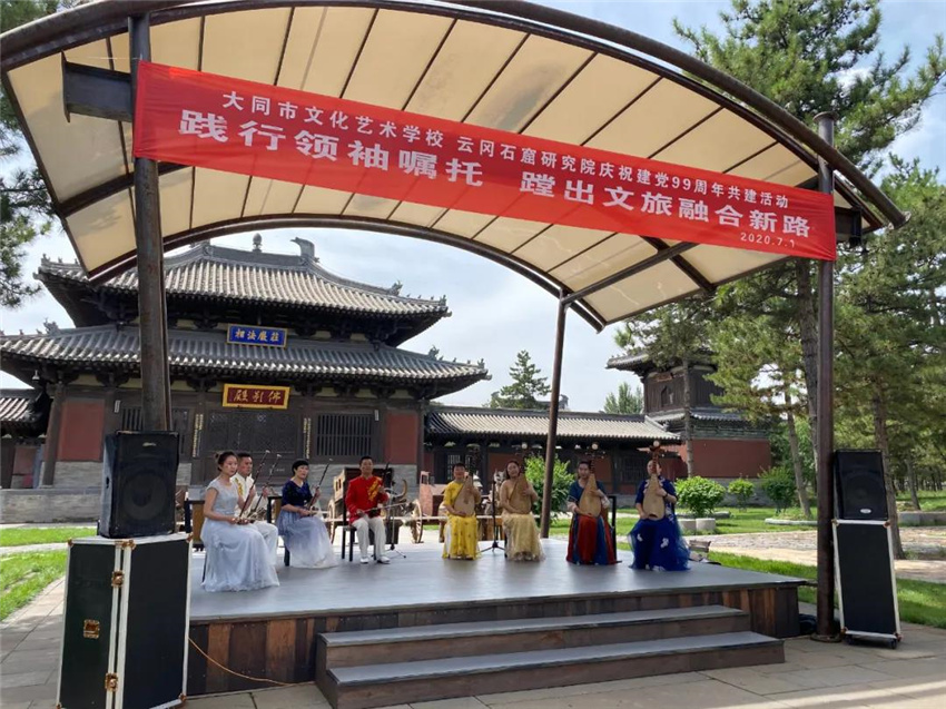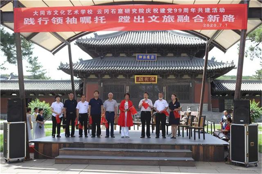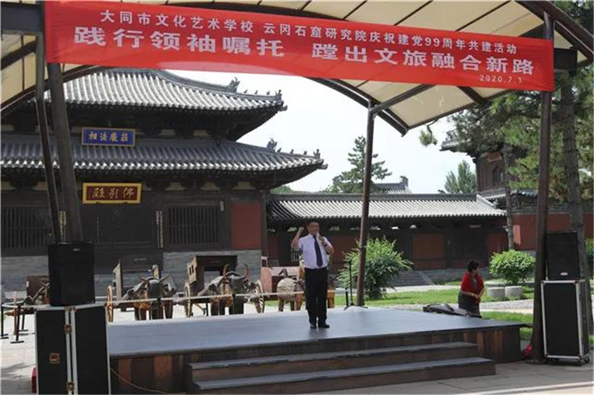 7月1日上午,阳光灿烂,云冈石窟景区20窟南广场,鲜艳的小国旗在人们手中挥舞。为了庆祝中国共产党成立99周年,进一步学习贯彻落实习近平总书记视察云冈石窟重要指示精神,增进党员之间的学习交流,增强党组织的凝聚力和战斗力,云冈石窟研究院与大同市文化艺术学校联合开展的以“践行领袖嘱托,蹚出文旅融合新路”为主题的党总支共建活动在这里举行。